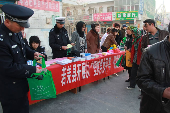 为进一步深化妇女儿童维权工作,加大维护妇女儿童合法权益的工作力度,拓展妇女儿童维权领域,3月5日若羌县妇联、司法局、工会、公安局、红十字会、团委、人口和计生委等8家单位在若羌县新苑市场门前联合开展以“坚持男女平等·促进社会和谐”为主题的“三八维权周”宣传活动,活动包括以十八大精神、“两法”、“两规划”、《妇女权益保障法》、《新疆维吾尔自治区预防和制止家庭暴力规定》、《中华人民共和国未成年人保护法》、《中华人民共和国人口与计划生育法》、“平安家庭”创建、“六五”普法等有关法律法规知识为主题的维权宣传咨询服务等。