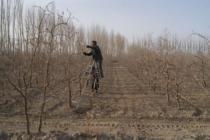 图为枣农在技术人员指导下修剪枣树