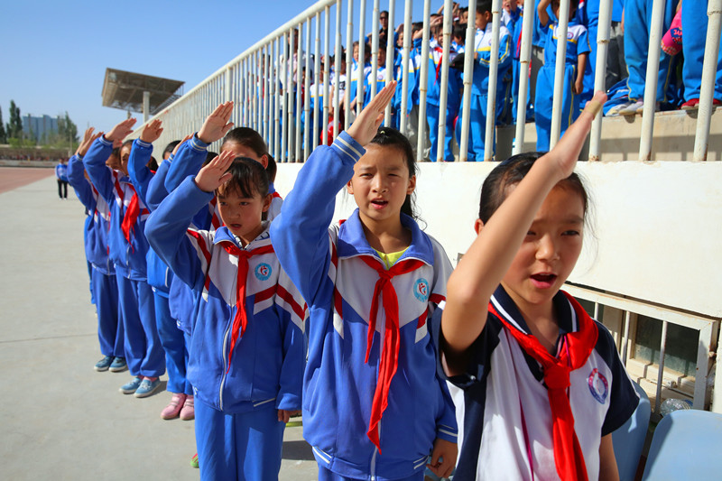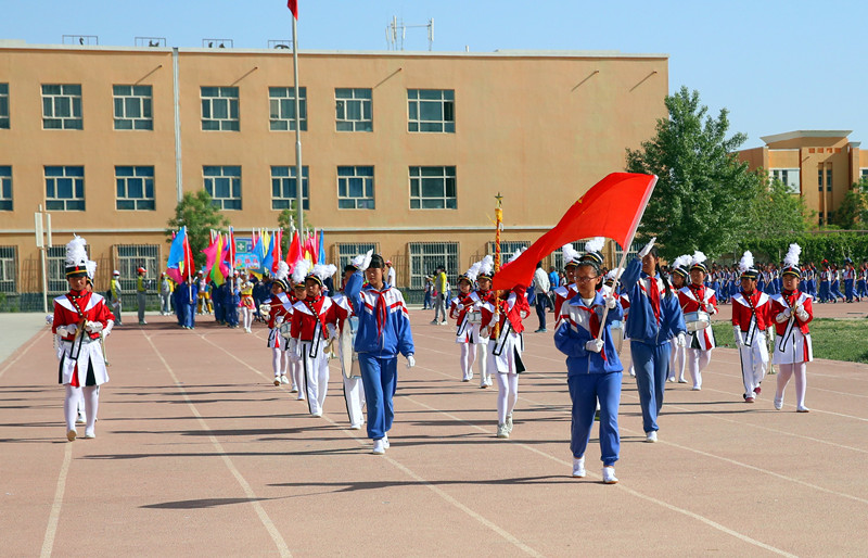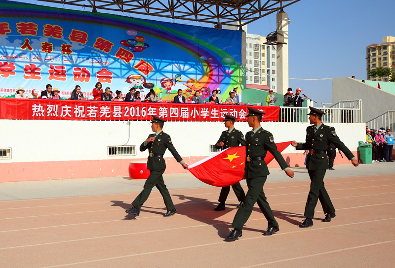 4月21日上午,若羌县第四届小学生“人寿杯”运动会开幕,这是国旗方队向主席台走去。