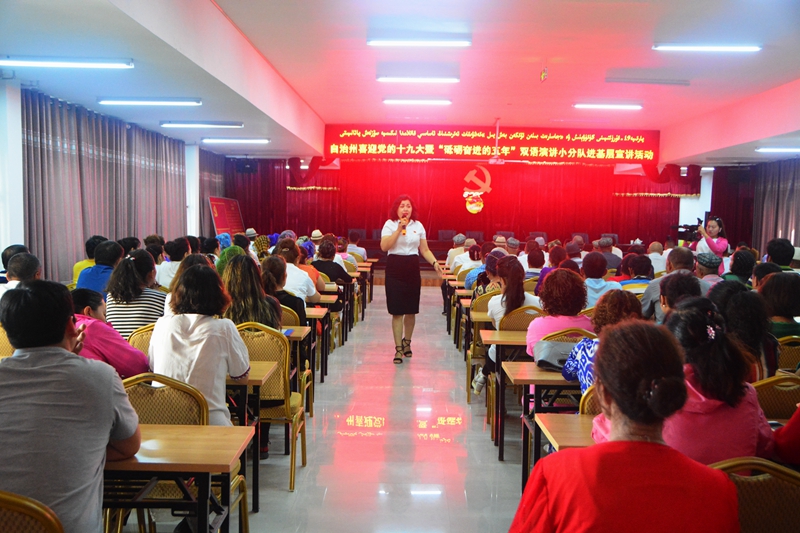 7月5日,自治州喜迎党的十九大暨“砥砺奋进的五年”双语宣讲小分队赴若羌县开展示范性巡回宣讲,受到当地各族干部群众、武警官兵和教师们的热捧。