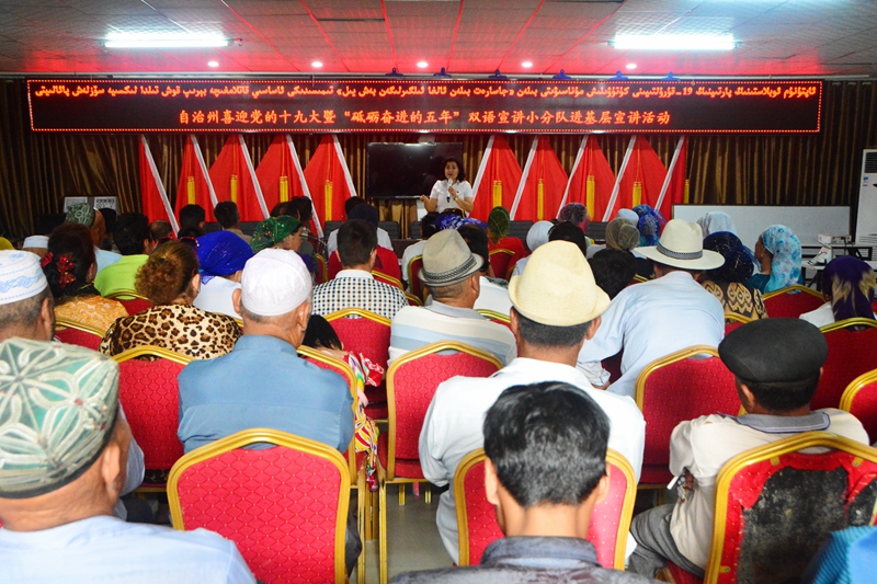 暴恐分子”“两面人”给我们的幸福生活带来的危害,讲党的九项惠民政策,与群众分享身边的感人故事,台上讲的真切,台下听得认真,尤其是《党的惠民政策亚克西》、《撸起袖子加油干、喜迎党的十九大》等宣讲,深深烙在各族干部群众的心里。