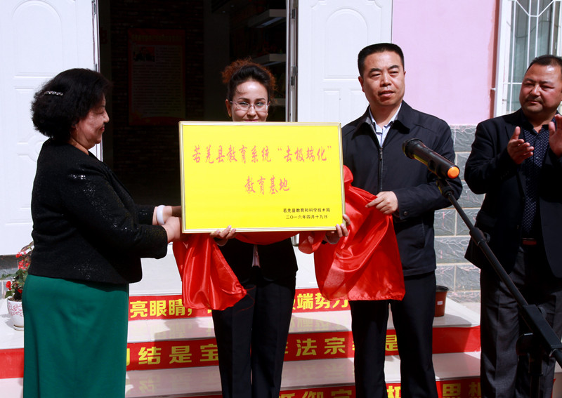 4月19日下午,若羌县教育系统“去极端化”教育基地揭牌仪式在该县第二小学举行。 通讯员 李海毅