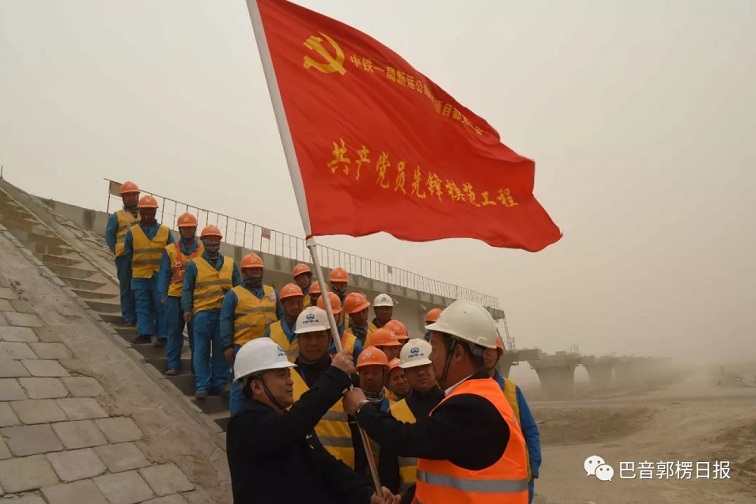 4月20日,中铁一局格库铁路新疆段PJS标项目部 “共产党员先锋模范工程”授旗仪式在台特玛湖特大桥头举行。巴州日报者 陈剑飞 摄
