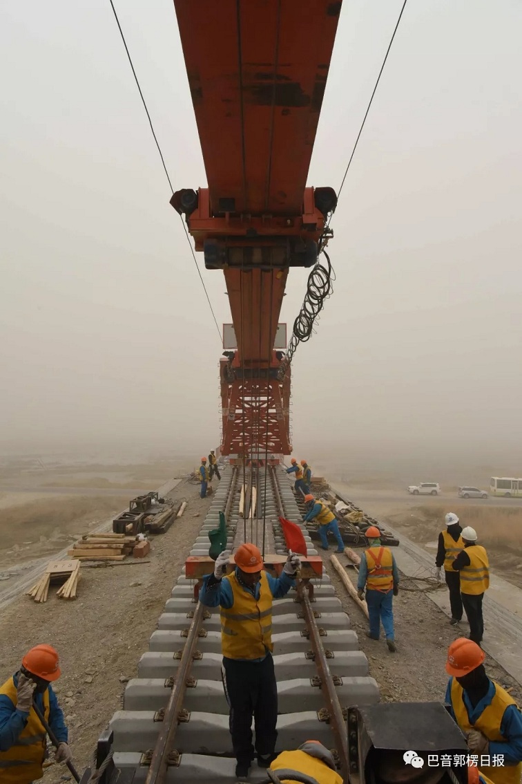4月20日,台特玛湖特大桥铺轨工程施工现场。巴州日报记者 陈剑飞摄