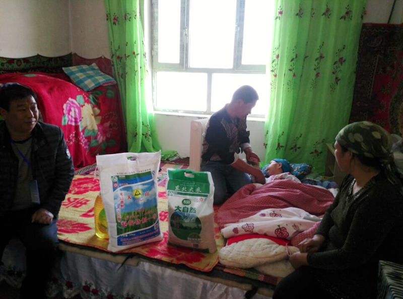 “救人如救火”若羌县畜牧兽医局住英苏牧业村工作组组长雷玉金代表大家及时将筹集的1050元交到了艾力·肉孜手中,并送去了大米、清油、面粉等慰问品,鼓励他们树立生活信心。